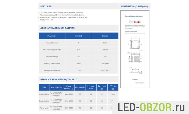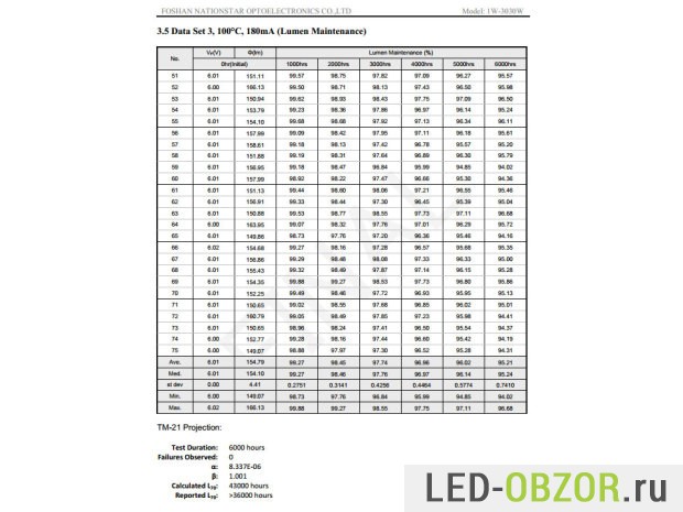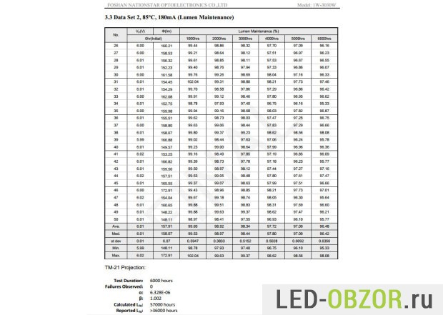 Светодиодный уличный прожектор собран на диодах NationStar SMD3030 номинальной мощностью 1W. Подробной спецификации на них не нашлось, по есть протокол испытаний на срок службы по стандарту L70 при разном нагреве.