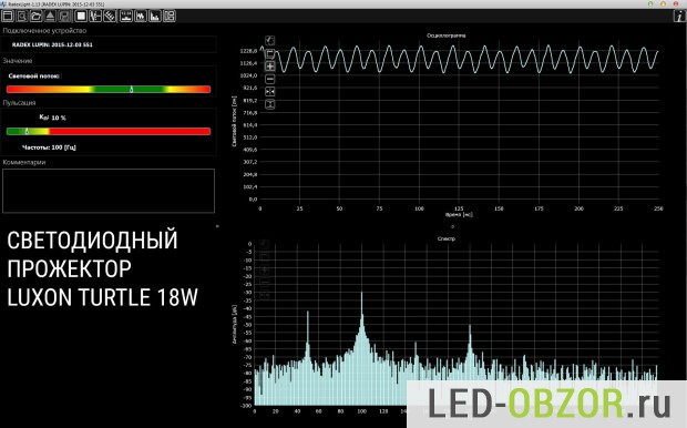 Для измерений использовался незаменимый прибор Radex Lupin, лучший прибор по цене и функционалу. В качестве фотодатчика используется фотодетектор Osram. Имеет USB подключение к компьютеру и программное обеспечение, которое показывает спектрограмму и осциллограмму светового потока. Прибор стоит около 5 т.руб.