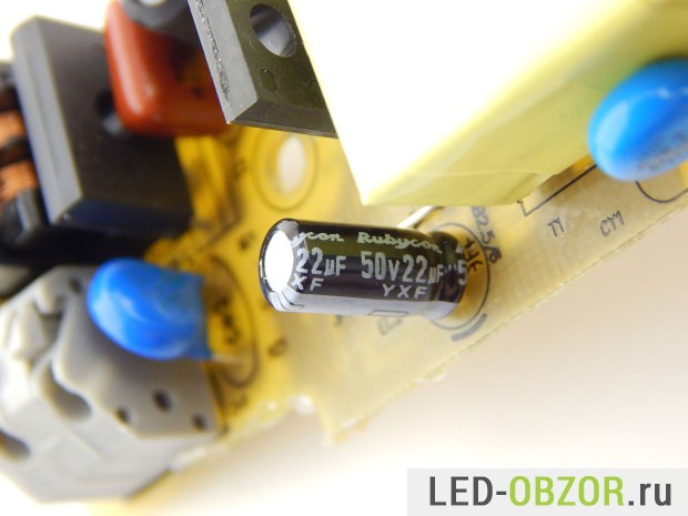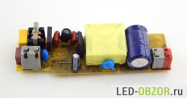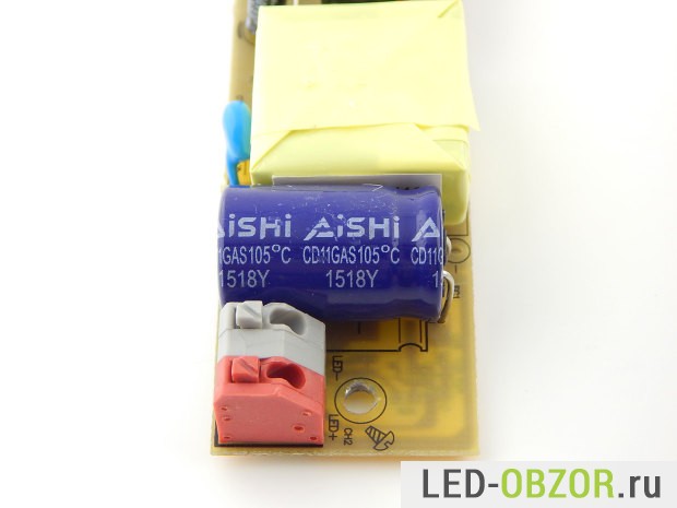 Напряжение на выходе драйвера 90В, потому что напряжение падения на светодиоде 6V. Электролитические конденсаторы используются фирменные японские Rubycon и Aishi. Ресурс работы таких конденсаторов до 50-70 тысяч часов. Современные хорошие светодиоды работают дольше, чем блок питания к ним.