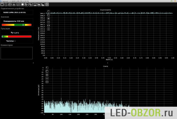 Пульсации света обещают не более 10%. Прибор Radex Lupin показал всего 1.32%, что говорит о полном отсутствии мерцания с частотой 100Гц. Спектрограммы вы можете видеть на скриншоте.