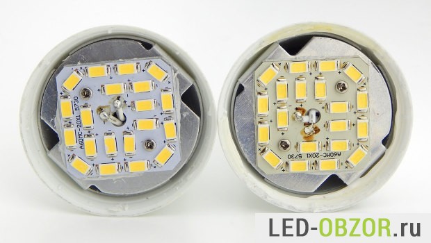 Такой образец непрерывно проработал 4500 часов и на нём стали проявляться следы выгорания люминофора. На фото это видно не особо четко, но есть отличия: