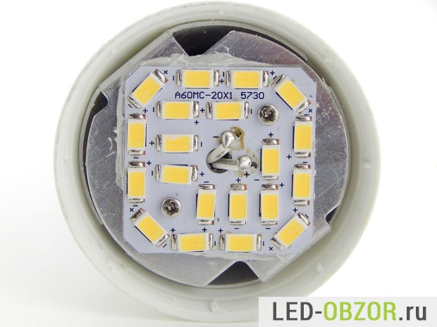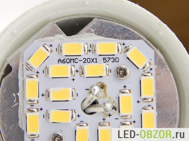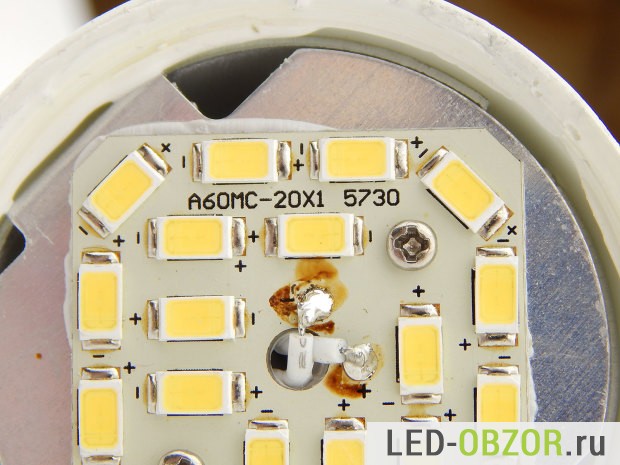 По паспорту должны быть установлены светодиоды SMD 2835. Но после снятия оказалось, что стоят SMD 5730. Есть вариант и на одноватных SMD чипах. Видимо начинку поменяли на новую, а новую документацию печатать не стали, всё равно никто не читает.