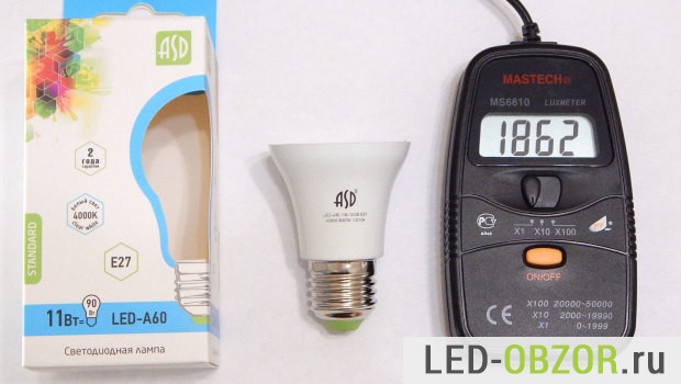В обзоре рассмотрим светодиодные лампы ASD LED A60 на 11Вт серии Standard, артикул BLSA1124. Для такой большой мощности очень подозрительно выглядит отсутствие радиатора с ребрами или отверстиями для циркуляции воздуха. Предположил, что мощность производителем завышена, и что светодиоды должны сильно греться. Заглянул к коллеге Ламповоду на сайте lamptest.ru, он тоже тестил АСД, и сделал неутешительные выводы.