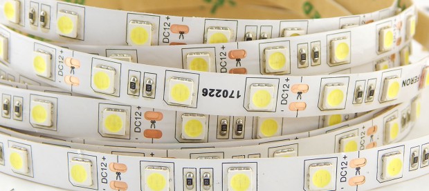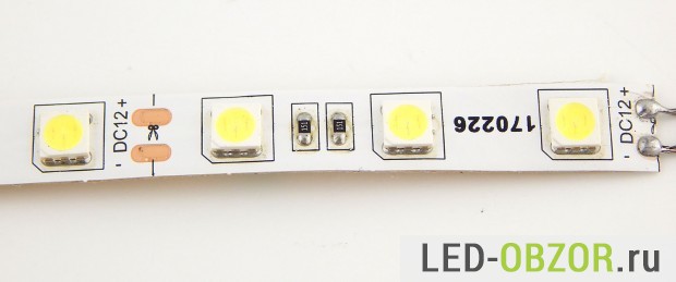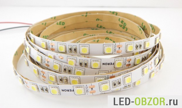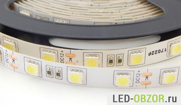 Данный образец имеет самые распространённые характеристики 60 led/м и светодиоды SMD 5050. Мощность такой светодиодной ленты 5050 может быть от 5 до 15 вт/м. при равном количестве диодов. Цифрами 5050 обозначается только размер корпуса, который будет равен 5 на 5мм, а кристалл внутри может быть любой, очень слабым или стандартным. Образец предоставлен в виде катушки на 5м.