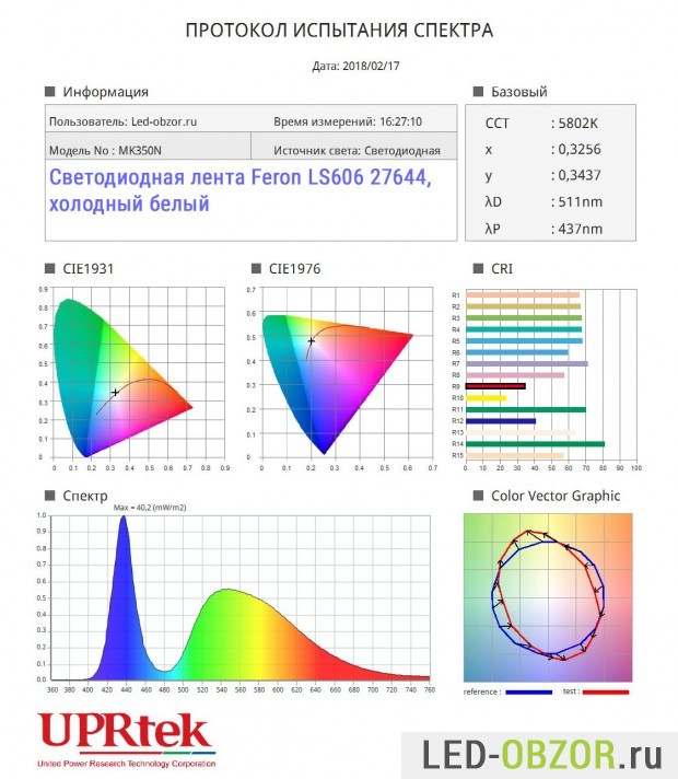 Показатель в 5800 Кельвинов соответствует холодному белому свету, что и обещал Feron. Показатель цветопередачи оказался ниже, всего CRI 65,5. Для жилых помещений требуется CRI от 70 до 90. CRI влияет на передачу цветов при искусственном освещении. Если CRI низкий, цвета будут бледные, глаза будут утомляться. Так же снижается контрастность, особенно при чтении газет и книг.