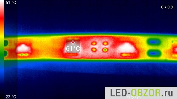 После прогрева в течение 30 минут измеряем нагрев светодиодов SMD 5050. Используем тепловизор Thermal Seek Compact Pro разрешением 240×320 точек. Нагрев получился не высокий даже без использования алюминиевого профиля, всего 61° при потреблении 9 вт/м. Обычно при энергопотреблении более 10W клеят на профиль из алюминия, чтобы избежать высокого нагрева.