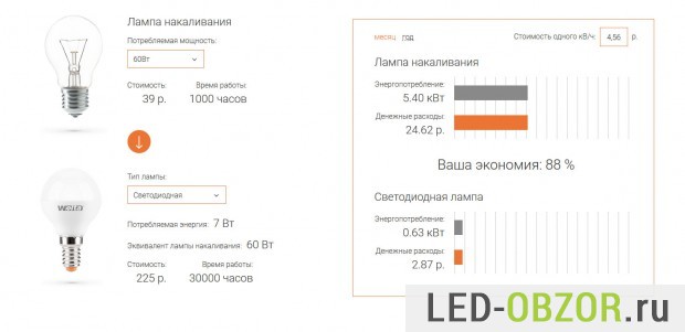 Если вы впервые переходите на диодное освещение, то уменьшение расходов и потребление энергии можно наглядно увидеть на странице «Калькулятор экономии».