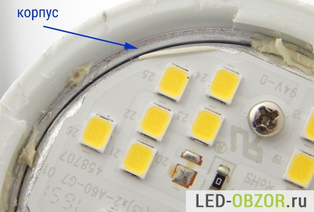 Конструкция соответствует правильной системе отвода тепла от светодиода. Корпус лампы является радиатором из алюминия, покрытым тонким слоем теплопроводного пластика. Пластина со светодиодами запрессована в алюминиевый стакан. Такая конструкция получается практически неразборной, разобрать можно только с большими повреждениями. Обычно приходится распиливать ножовкой по металлу, иначе всё превращается в металлолом.