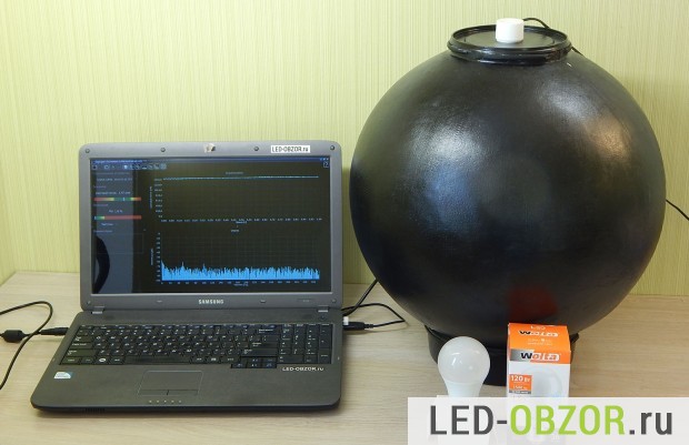 Световой поток измеряем в фотометрическом шаре. Результат получился очень хороший, при низкой мощности световой поток равен обещанному 1470лм. Этот показатель в пределах погрешности измерительного прибора.