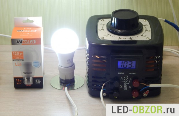 Для регулирования яркости светодиодных ламп Е27 используют диммеры. Но внутри установлен стабилизатор, который при снижении напряжения поддерживает яркость на постоянно уровне. Поэтому диодные лампочки имеют соответствующую маркировку, если она поддерживают диммирование. Тестируемый образец регулирование яркости не поддерживает, и при снижении напряжения питания потухнет.