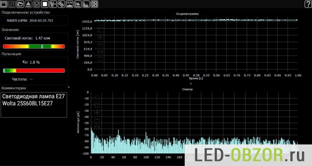 Также на осциллограмме видно, что коэффициент пульсаций светопотока 1,8%, то есть практически отсутствует. Это показатель того, что драйвер хорошо справляется с нагрузкой, никакого мигания и мерцания нет.
