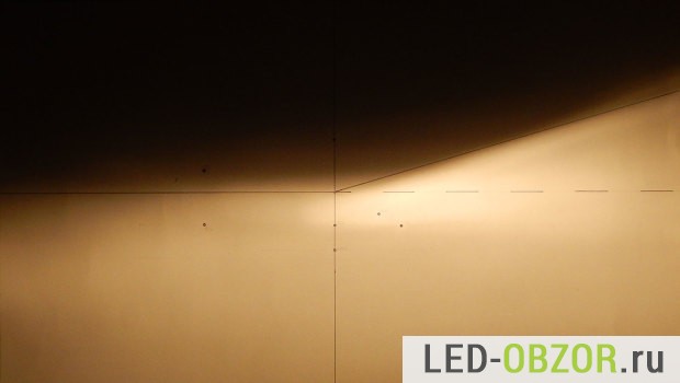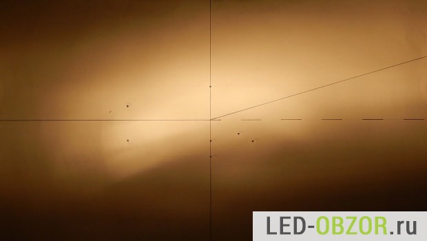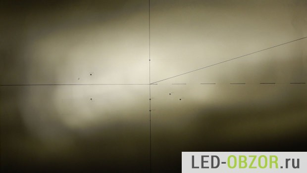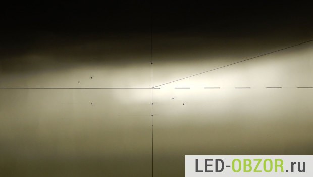 Сначала позиционирую фару с галогенкой, чтобы галка совпадала. Не меняя положения фары, ставлю диодную, чтобы узнать, совпадёт она с галкой на стене или нет. Перед проведением замеров прогреваем LED автолампу H4 в течение 30 минут.