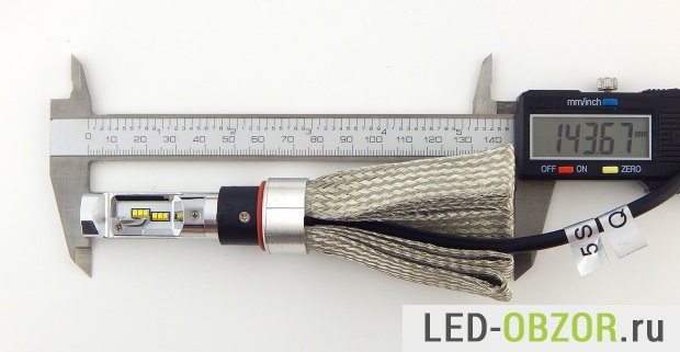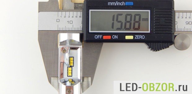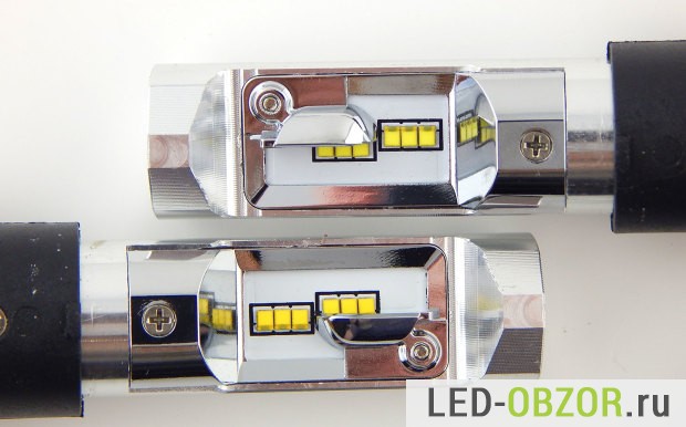 Для наглядности сравним размеры с популярной моделью светодиодных ламп для авто H4. На фото сравнение образца с автолампой CL6, которая сверху.