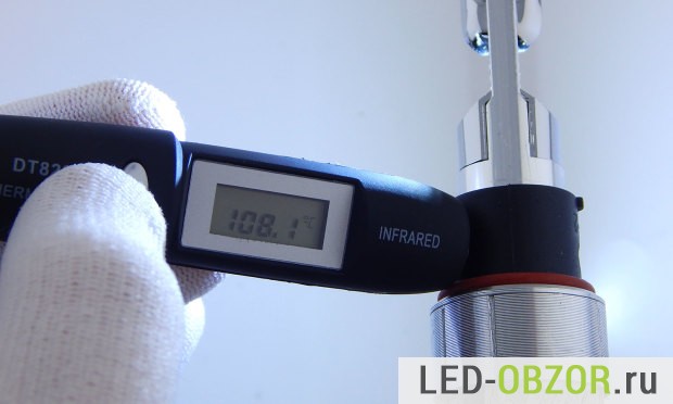 Для измерения нагрева используем откалиброванный мини-пирометр. В результате многочисленных опытов по замеру нагревания светодиодов пришлось отказаться от термопары. У этого пирометра металлическая окантовка датчика. Пластик при таких температурах начинает плавится.