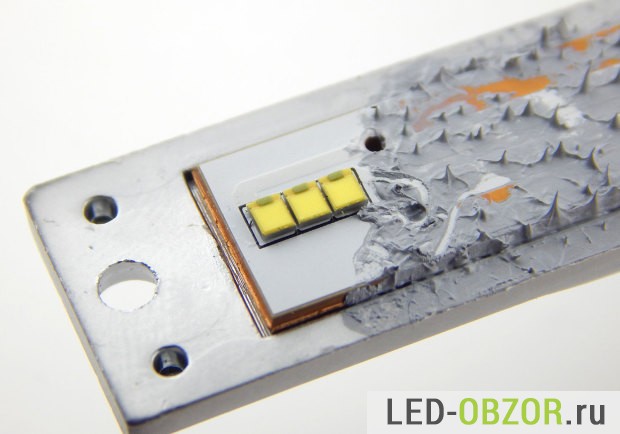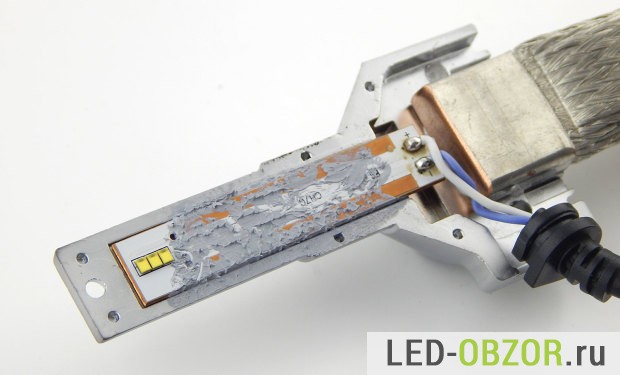 Сборка и материалы оказались очень хорошими, термопасты не пожалели, такое редко встречается. Диоды стоят на медной пластине, а не алюминиевой. Теплопроводность меди выше почти в 2 раза, и она гораздо дороже алюминия. Гибкая часть радиатора обжата медью и посажена на теплопроводный клей, хорошо так приклеена. Лепестки обжаты очень плотно, пробовал их разболтать, не получилось.