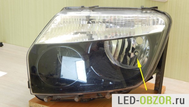 Работу светодиодных ламп проверяем в рефлекторной фаре от Рено Дастер, линза используется от Ssangyong Actyon. Большинство светодиодных ламп H7 после установки вместо галогена светят гораздо выше или ниже. Электрокорректор угла наклона может только опускать фару вниз. Поэтому если лампочка светит низко, то поднять вверх не получится. Так же это сокращает дальность освещения.