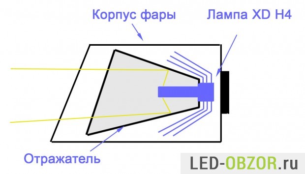 Образцы обозначаются «светодиодные лампы H7 XD». Основные параметры определяются типом установленных светодиодов. В данной модели установленные специализированные светодиоды CSP для автомобилей. Он состоит из 4 диодных кристаллов объединенных одним слоем жёлтого люминофора.