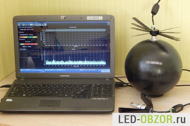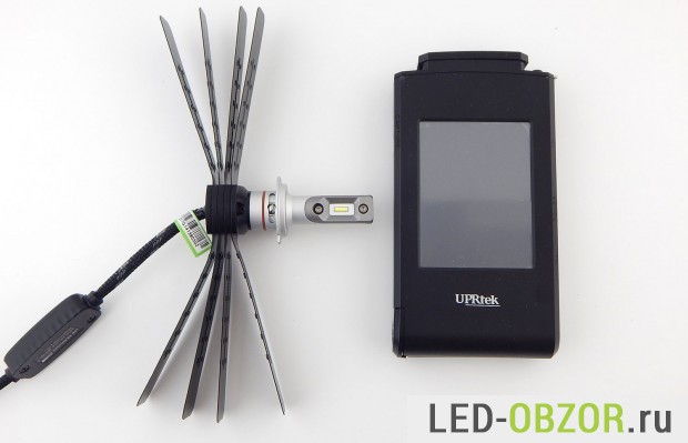 Перед замером светопотока прогреваем светодиодную лампу H7 до рабочей температуры. пластины радиатора расправлены. Лампочка помещает в фотометрическую сферу. Получаем световой поток эквивалент 2790 люмен. Результат очень хороший для автоламп H7 без вентилятора.