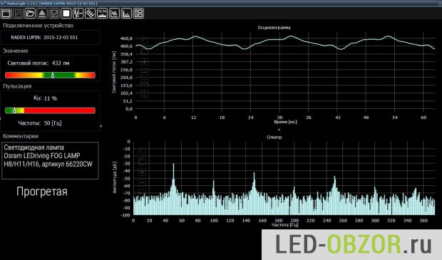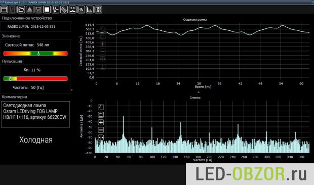 Для тестируемого образца световой поток указан эквивалентом. Показатель учитывает повышение чувствительности глаза в темное время суток к нейтрально белому свету, по сравнению с тёплым белым от галогена. Чувствительность повышается на 65%.