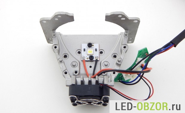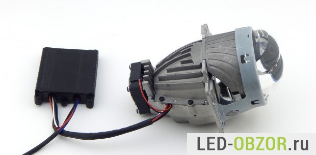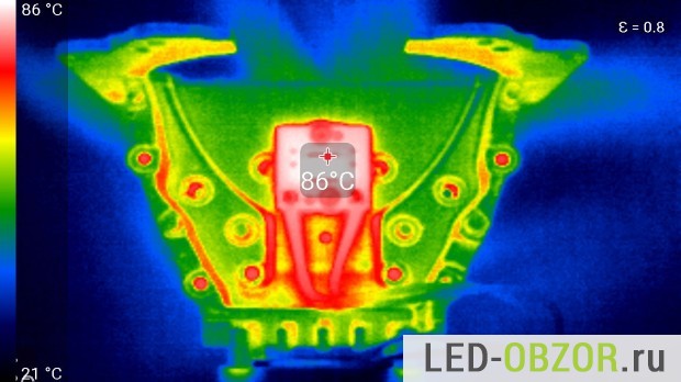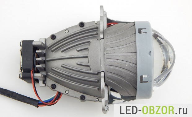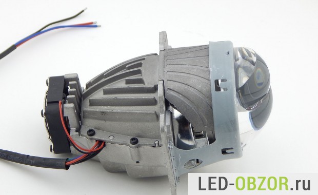 Bi Led линза для фары имеет достаточно большую массу и 2 радиатора с небольшим вентилятором диаметром 40мм. Нагрев основного светодиода получился всего 86° за счёт большого радиатора. По спецификациям производителя нагрев может достигать 140°-150° градусов, при сохранении заявленных характеристик и срока службы. При более высокой температуре он кристалл будет деградировать и количество люмен будет снижаться быстрее.