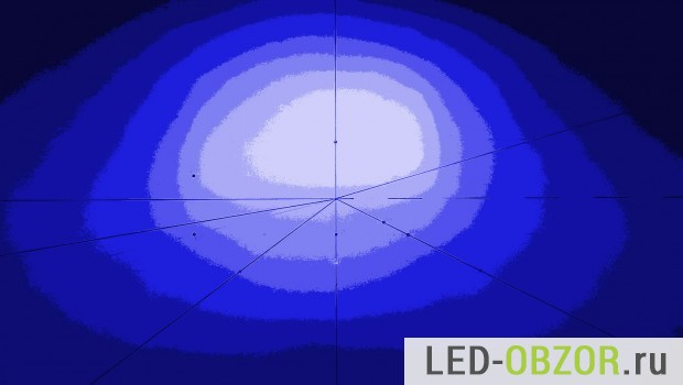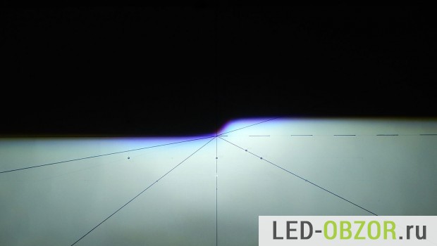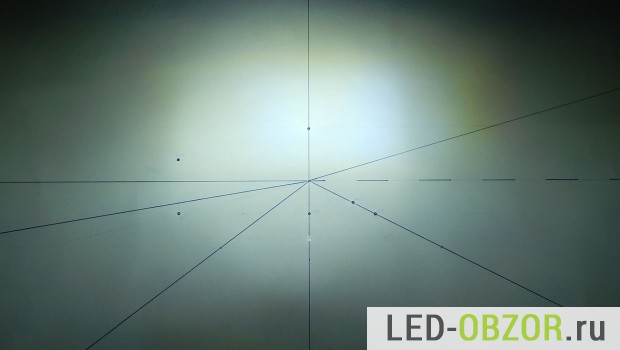 При сравнении мы видим, что дальний имеет недостаток как у Хеллы 3R, он светит выше дороги. На правильном светодиодном модуле пятно должно быть практически по середине таблицы. Основной поток светит в небо и только малая часть попадает на дорогу.