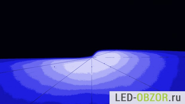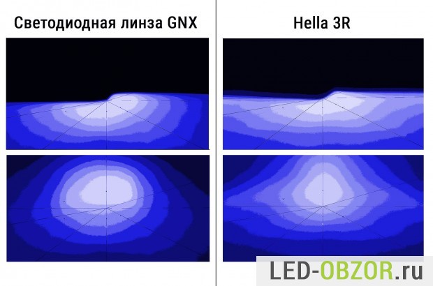 По освещенности контрольных точек светодиодная линза обеспечивает освещенность в среднем на 50% выше ксенона. При этом уровень ослепления встречных автомобилей в точке B50L немного ниже Хеллы.