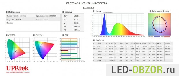 При помощи спектрометра UPrtek MK350 измеряем цветовую температуру и индекс цветопередачи Bi Led. Цветовая температура получилась 5879К, что соответствует слегка холодному белому цвету. 5000К -5500R считается нейтрально-белым.