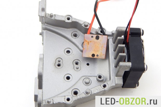 Изготовитель умудрился сэкономить даже на термопасте, которая стоит несколько китайских копеек, но прилично влияет отвод тепла и на надежность работы. Поверхность радиаторов шероховатая, поэтому контакт с основанием светодиодов не может быть хорошим на 100%.