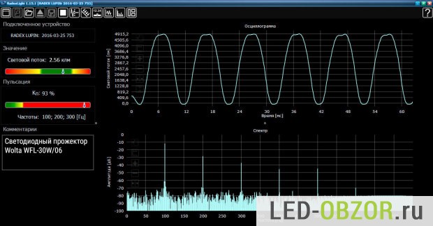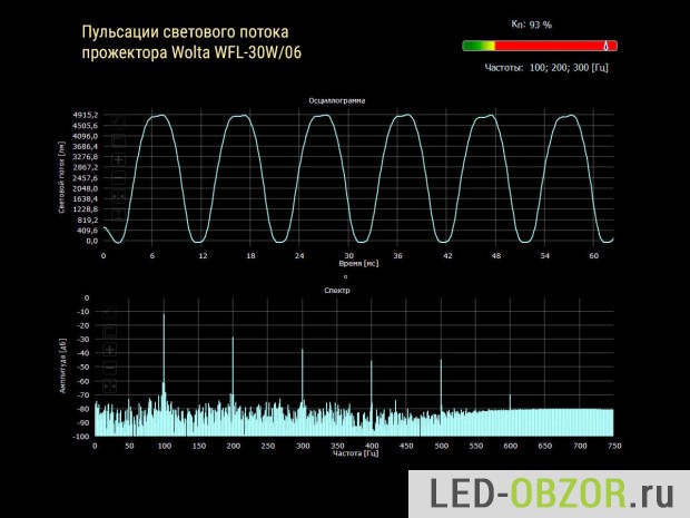 Тестируемый образец имеет пульсации 93%, но для наружного освещения этот показатель не важен. В данной ценовой категории у всех производителей высокий коэффициент. В недорогих уличных светодиодных прожекторах не ставят конденсаторы для стабилизации тока. Это позволяет повысить коэффициент мощности до 0,99 – 100% Конденсаторы подвержены высыханию и потере емкости, их отсутствие упрощает источник питания. Чем меньше компонентов используется в схеме, тем она надежней.