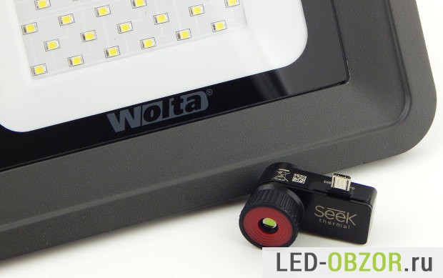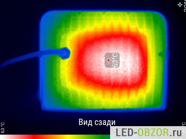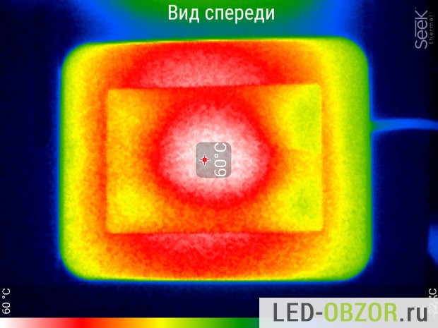 Примерно температура светодиодов должна составлять 68° для снижения на 4,8%. Если посмотрим на теплограмму корпуса уличного светодиодного прожектора, нагрев корпуса, где закреплены светодиоды 63°. С учётом разницы между градусами LED кристаллов и радиатором, в среднем она +10°, получим примерно 73° на диодах. Это примерно соответствует расчётным 68°.