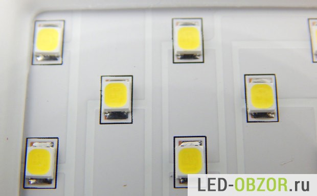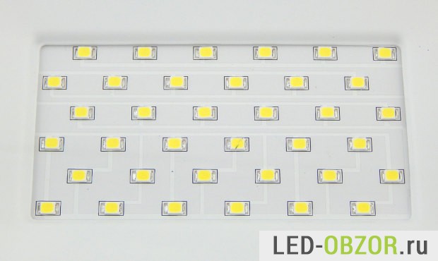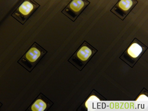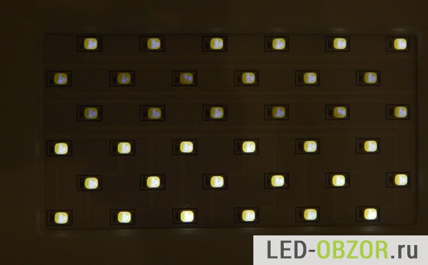 Всего установлено 36 лед диодов. Чтобы косвенно оценить качество LED, включим их так, чтобы они немного светились. Таким образом мы увидим, насколько велик разброс параметров, то есть отличие электрических характеристик каждого. Если параметры сильно отличаются, то одни диоды будут светить, другие не будут. Значит качество низкое, и надежность будет такого изделия будет не высокая. Потому что яркие LED будут нагружены сильнее других.