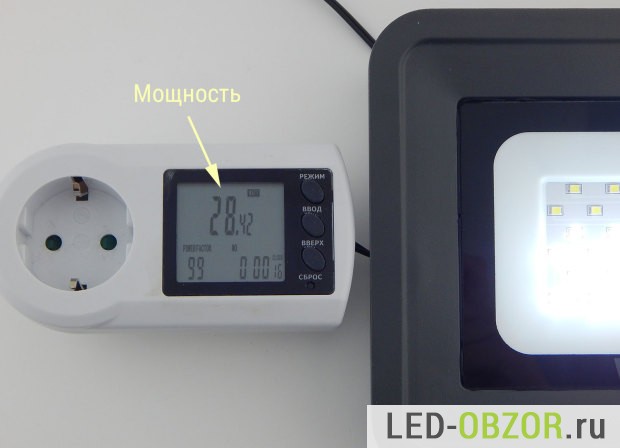 Перед проведением замера образец прогревается в течение часа. Мощность холодного получилась 28,4W, после прогрева 28,2W. По этому показателю можно судить, что светодиоды хорошего качества не перегреваются, работают номинальном режиме. У диодных ламп и лед светильников работающих с перегревом энергопотребление упало бы на 2-3W. Этот показатель был выявлен во время многочисленных обзоров и тестов.