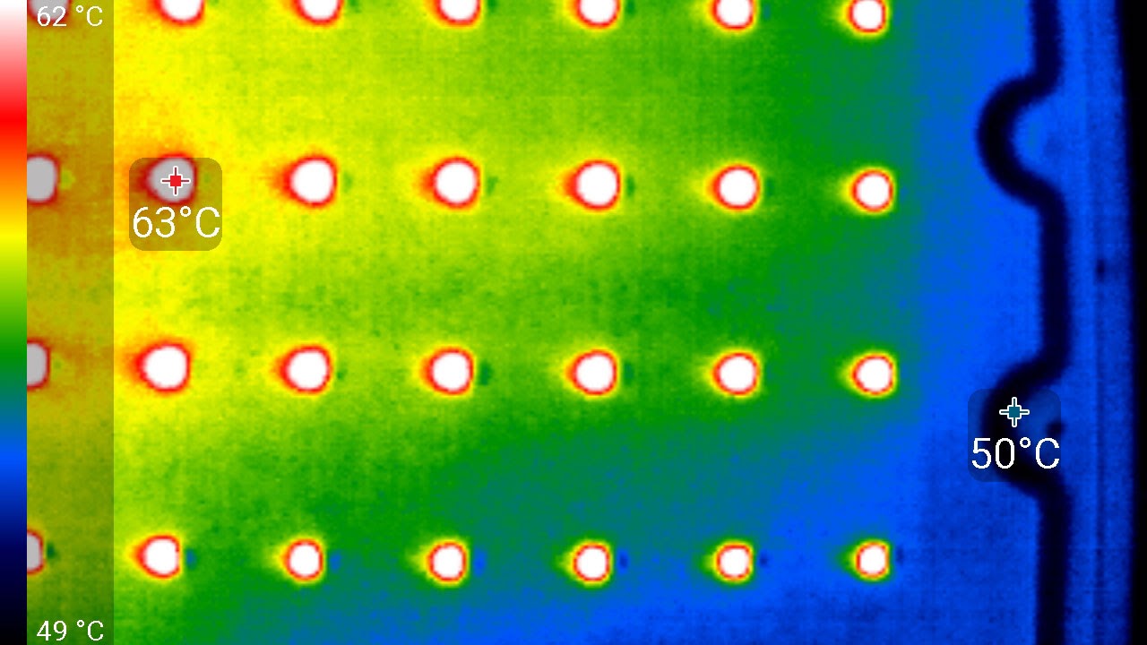 Благодаря большой площади системы охлаждения кристаллы светодиодов греются до 63°. По документации светодиодов Osram Duris S5 нагрев кристалла допустим до 125 градусов при сохранении заявленных характеристик.