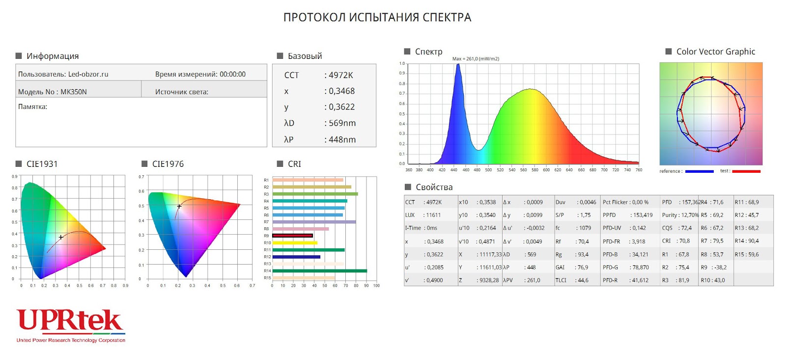 По результатам тестирования отклонение составило 3% от заявленного при допустимых ±5%, это отличный результат. Необходимо учитывать погрешность измерительных приборов, при измерении светового потока допустима погрешность приборов до 15%.