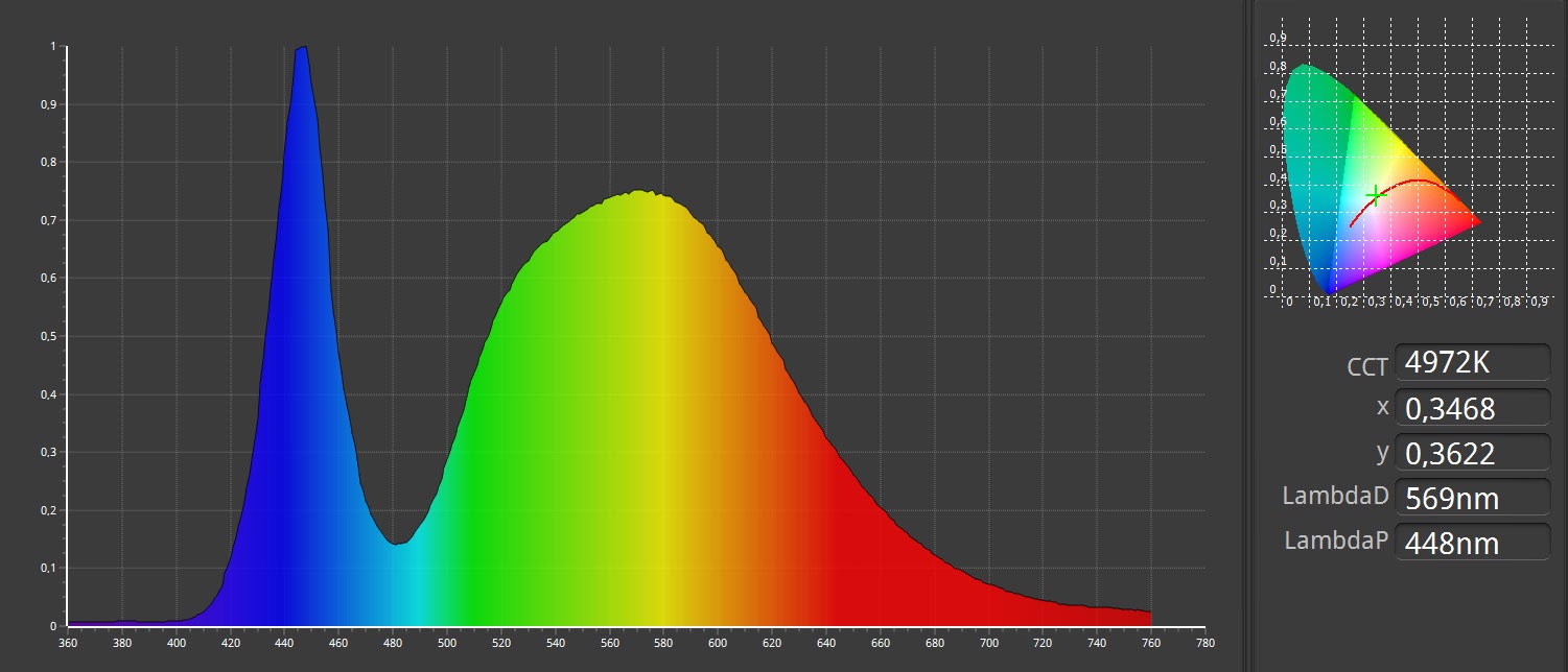 По результатам тестирования цветовая температура 5000K, индекс цветопередачи 71 CRI. Низкая цветопередача значительно снижает стоимость светодиода, поэтому он применяется только для уличного освещения.