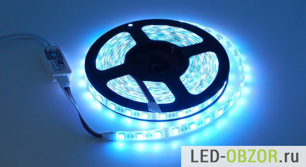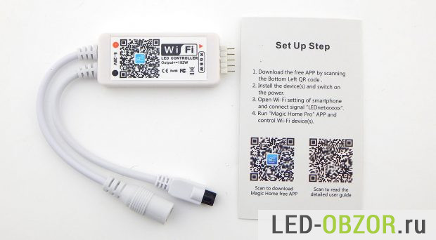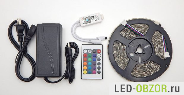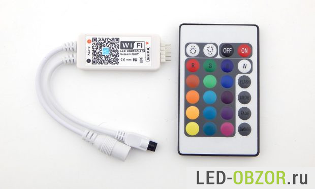 Светодиодные контроллеры активно совершенствуются и теперь в продаже появились блоки управления с несколькими способами управления, от стационарного до мобильного. В обзоре участвует влагозащищённая светодиодная лента 12В RGBW длиной 5 метров с контроллером двойного управления через Wi-Fi и инфракрасный пульт. В комплект так же входит блок питания 12В, блок управления, инфракрасный пульт.