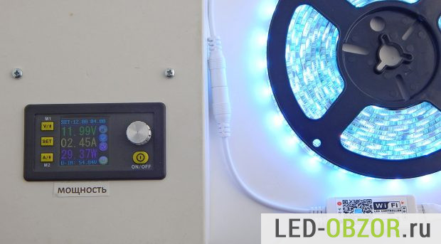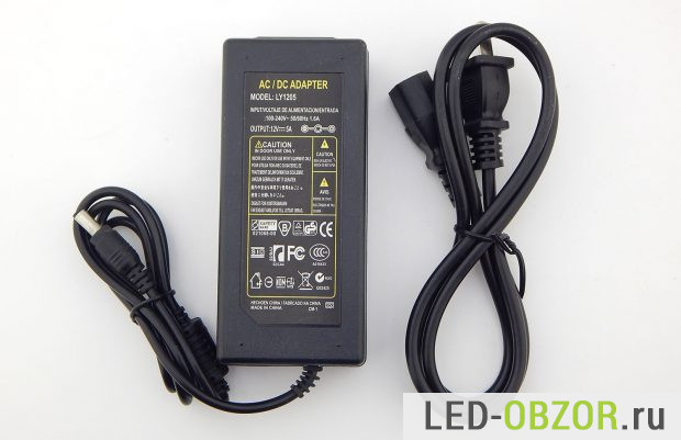 Для питания используется блок питания 12 вольт ноутбучного типа, он герметичен и защищён от влаги. Максимальная мощность 60 ватт, при силе тока 5 ампер. Этого достаточно для этой влагозащищённой светодиодной ленты 12в.