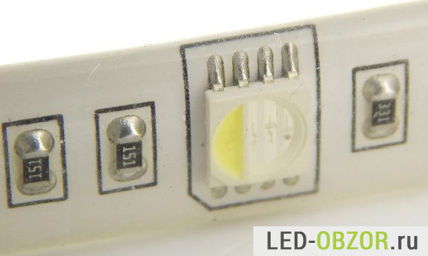 Каждый RGBW светодиод SMD 5050 состоит из 4 кристаллов (синего, красного, зелёного, белого), которые могут работать в различных сочетаниях, по-отдельности или одновременно. Секция белого света находится под жёлтым люминофором с краю светодиода.