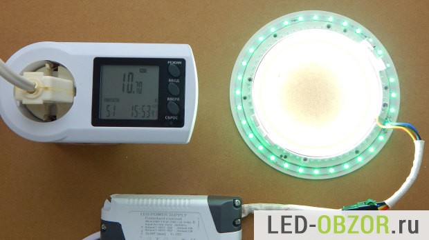 Полная мощность получилась 10,7Вт. Вычитаем 3W на драйвера, останется 7,7Вт чисто на светодиоды, которых всего 72шт.