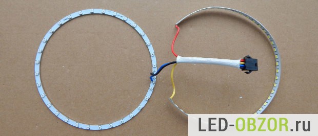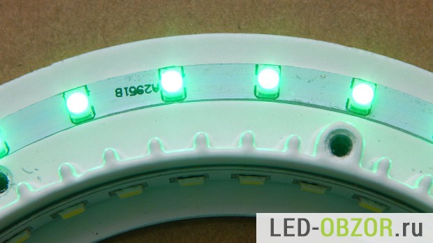 Подсветка реализована на обычных SMD 3528 в количестве 32 штуки, расположенных на миллиметровом алюминиевом кольце. Основание кольца самоклейное, можно прилепить и отодрать если приложить усилия, но держится плотно. «Зелёнка» проходит через оргстекло толщиной 6 мм и выходит с торца.