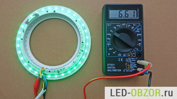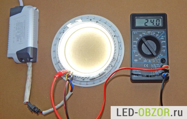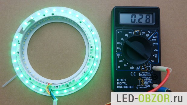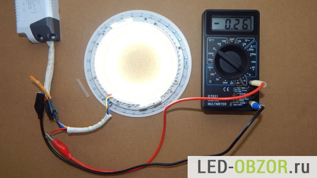 Измерив силу тока и напряжение на 40шт. 2835, получаем 24В * 0,26А = 6,25W это энергопотребление без драйвера. Это поменьше, чем номинальные 8W и может быть обусловлено использованием питания от другого изделия или для снижения нагрева.