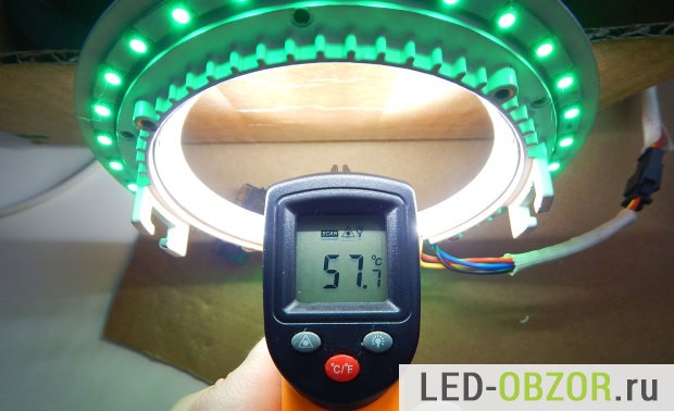 Проверяем температуру светодиодов после прогрева полностью собранного светодиодного светильника. Перед замером легким движением убирается задняя крышка и рассеиватели. Средняя температура на лицевой части линейки 57°.