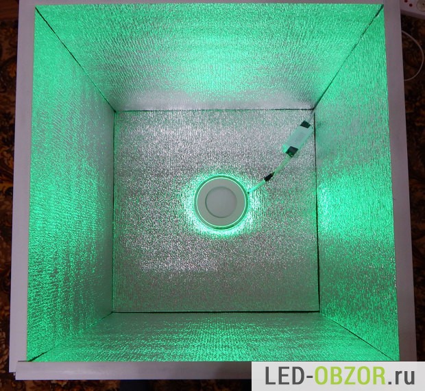Для измерения яркости будем использовать куб со светоотражающими стенками, габариты не позволяют засунуть его в измерительный шар.Учитываем, что LED элементы расположены глубоко, для рассеивания используется прозрачное стекло и матовый круг из пластика. За счет этого мы должны потерять примерно 30% светового потока. Проведем замеры со стекляшками и без них.