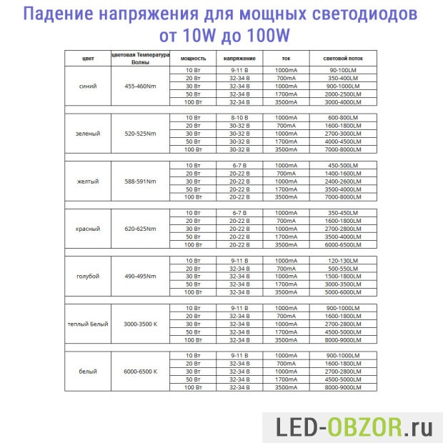 Таблица для мощных светодиодов 10W, 20W, 30W, 50W, 100W