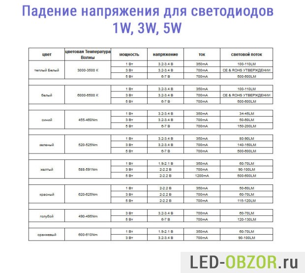 Для третьего пункта используйте примерные таблицы для 1W,3W, 5W, 10W, 20W, 30W, 50W, 100W, которые приведены выше. Но больше доверяйте характеристикам, которые вам дал продавец. Для однокристальных бывает 3V, 6V, 12V.