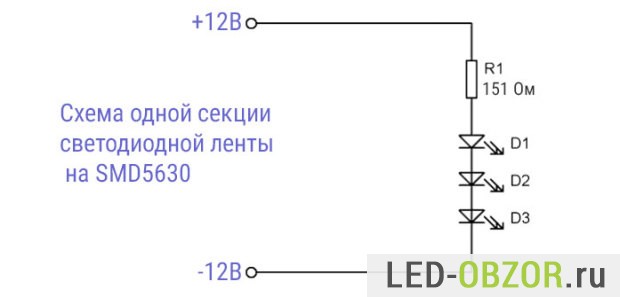 Одно из самых распространенных напряжений это 12 Вольт, они присутствуют в бытовой технике, в автомобиле и автомобильной электронике. Используя 12V можно полноценно подключить 3 лед диода. Примером служит светодиодная лента на 12V, в которой 3 штуки и резистор подключены последовательно.