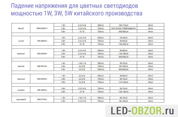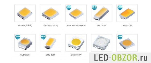 Наиболее распространены LED чипы с прямым напряжением в районе 3, 6, и 12 вольт. Модели на 6В и 12В используются преимущественно в автомобильных лампах, в бытовые изделия не устанавливаются.