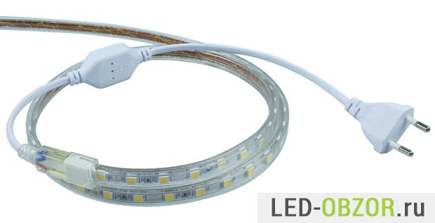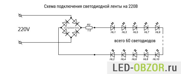 Примером простого включения без драйвера будет светодиодная лента на 220V. На ней последовательно соединены 60 штук, которые питаются от выпрямителя состоящего из диодного моста. Недостатком такой схемы является пульсации света с частотой 100 Герц, которые очень вредны для здоровья, но каждый реагирует на это индивидуально. Такую ленту можно резать только по 60 LED.