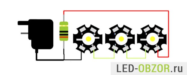 Примером будет светодиодная лента на 12В, в которой 3 LED и резистор включены последовательно.