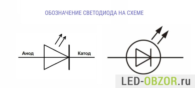 Обозначается на схеме двумя типами пиктограмм. Две стрелочки показывают что он излучает свет.